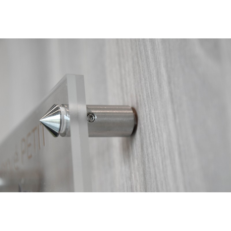 La plaque sera serrée entre la base et la partie supérieure de la fixation inox à l’aide d’une clé six pans fournie.